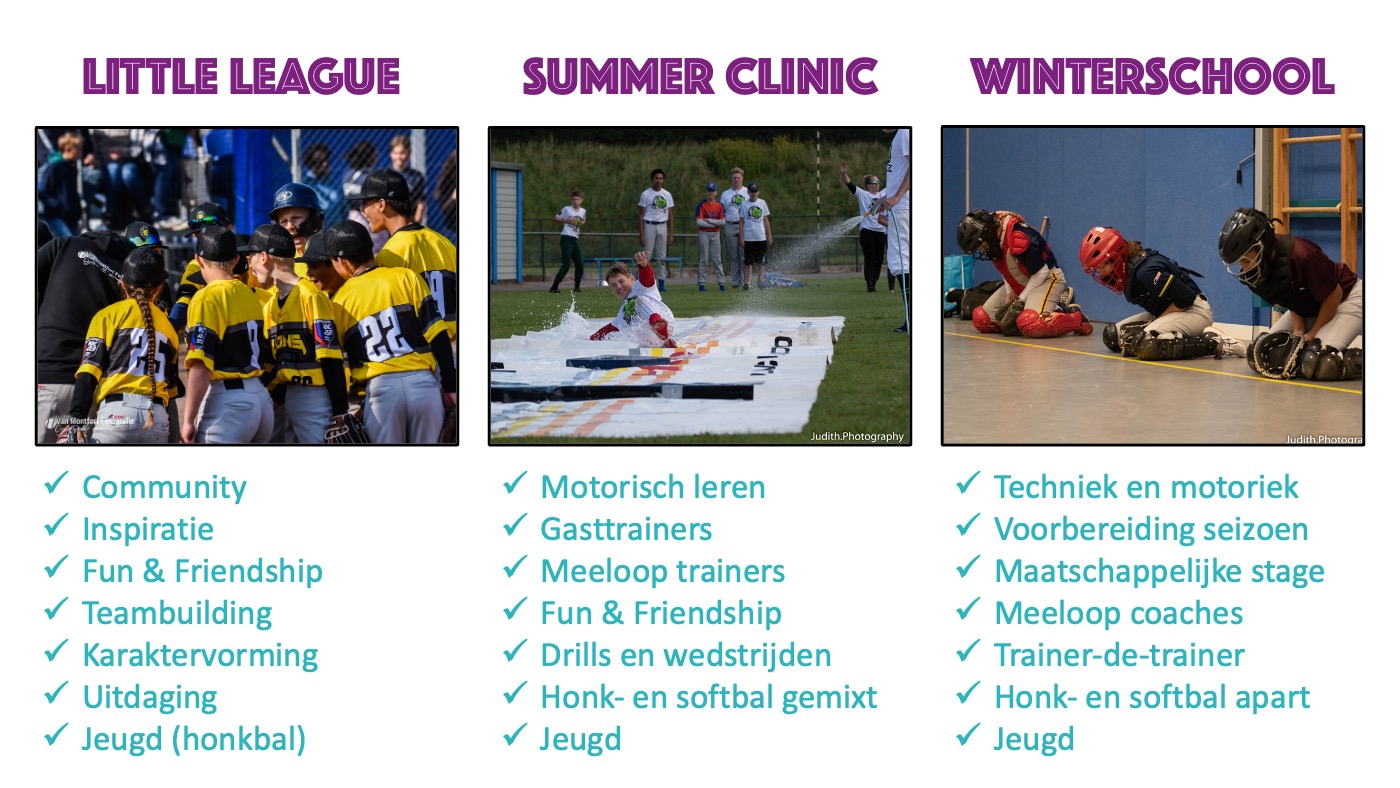 EXTRA INNINGS zet zich in voor het regionaal opleiden en bevorderen van jeugd spelers, trainer/coaches en betrokkenen binnen de honk- en softbal. Met drie jaarlijkse evenementen in regio Den Haag bieden wij gedurende het gehele kalenderjaar de mogelijkheid voor jeugd honk- en softbalspelers om elkaar naast de landelijke competitie en verenigingsstructuur te ontmoeten, te genieten en samen te trainen. Naast evenementen voor spelers, bieden wij ook cursussen aan trainers en coaches. Ga naar de Activiteiten tab voor meer!